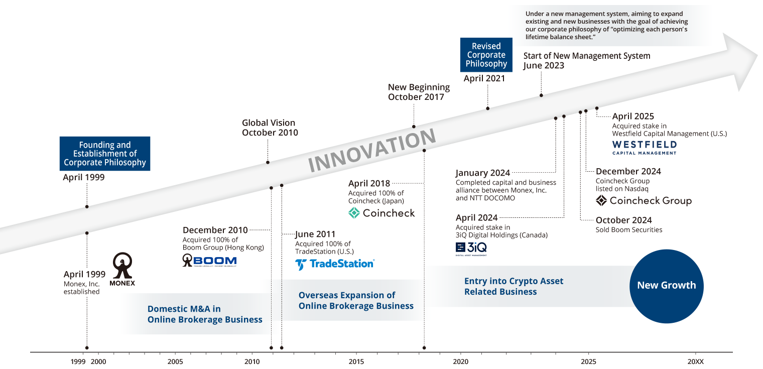 Since its founding in 1999, Monex Group has pursued the realization of its corporate philosophy by expanding its scale and global reach through M&A, while pursuing an optimal portfolio and creating innovation to enhance its corporate value.