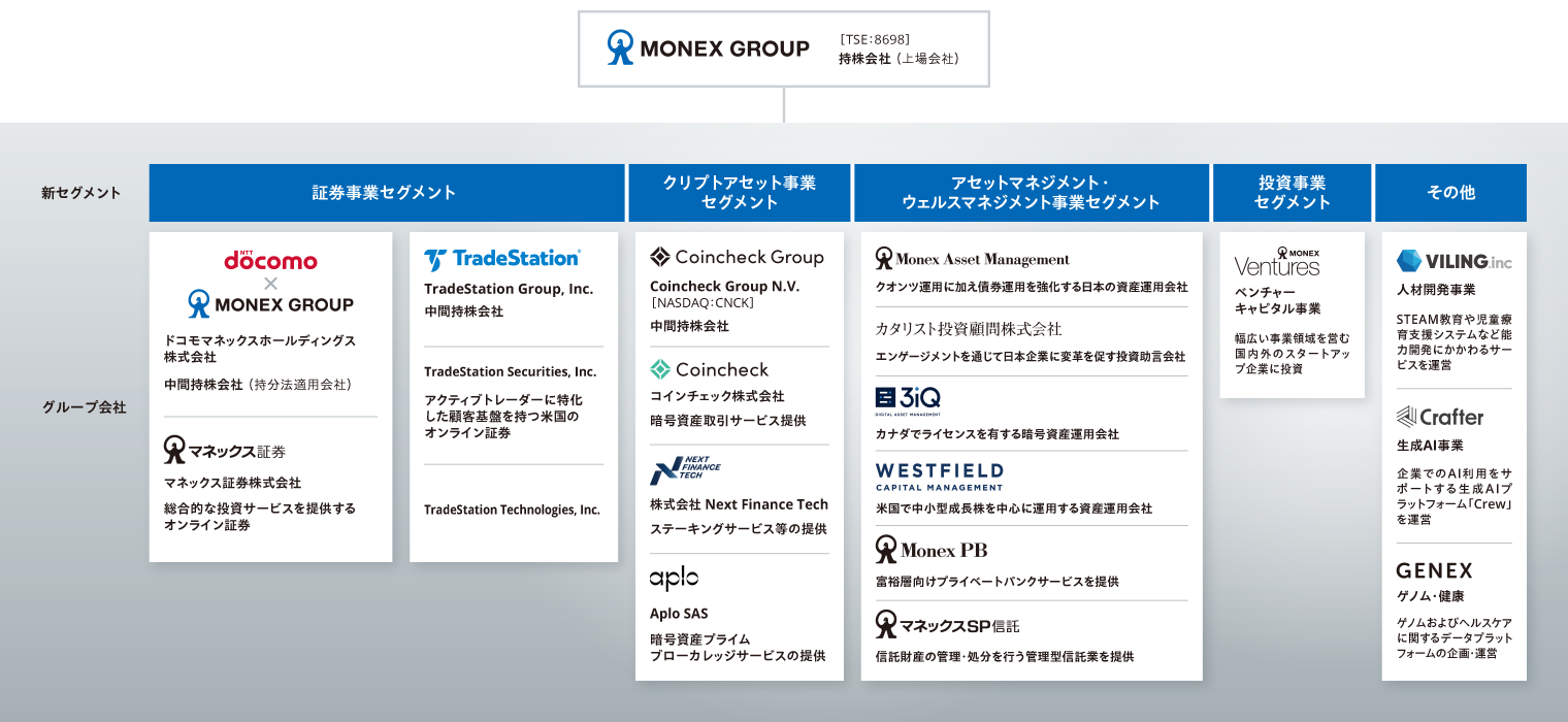 マネックスグループは、創業以来の基幹事業である証券事業の持続的な成長を図りながら、暗号資産関連事業をグローバルに推し進めるクリプトアセット事業、資産運用を通して個人の資産形成に寄与するアセットマネジメント・ウェルスマネジメント事業にも注力し、成長投資も活用しながら企業価値の最大化を目指しています。