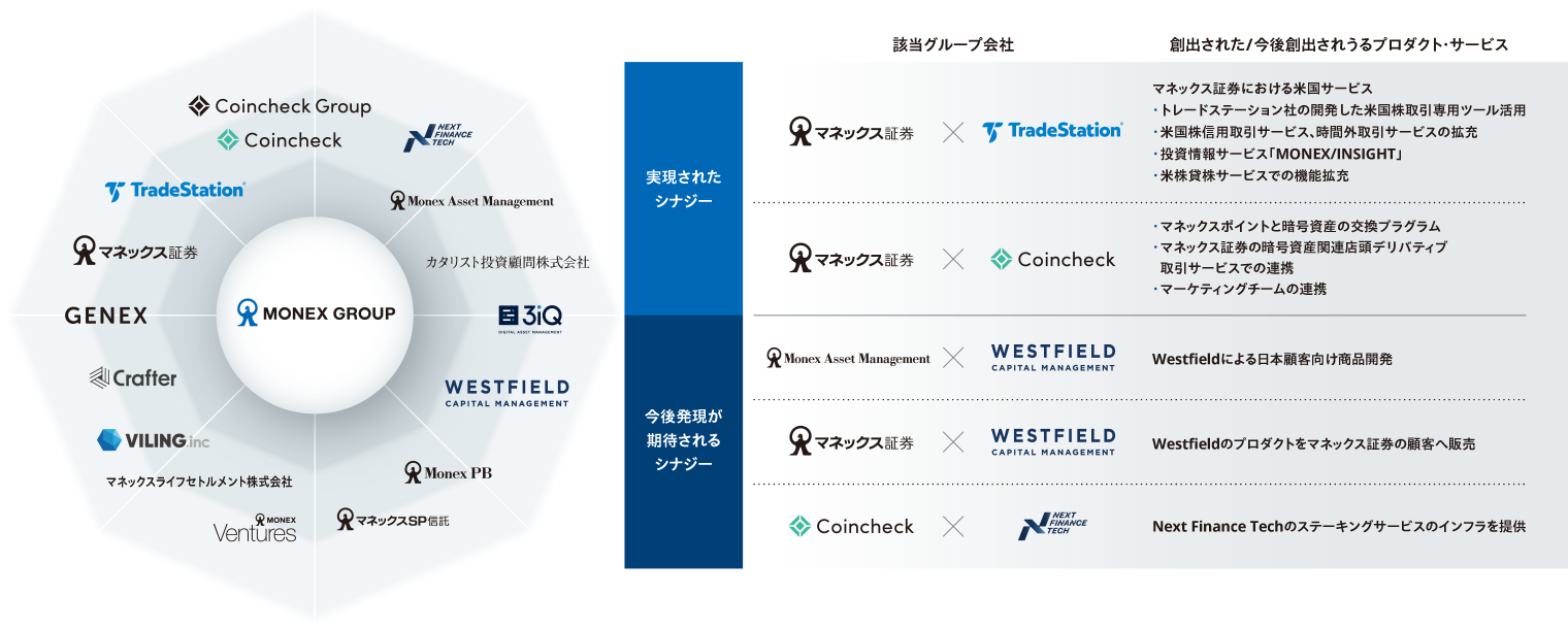 M&Aでマネックスグループに入り、バリューアップされたグループ会社は、セグメントを超えたシナジー効果を創出し、それぞれの価値となっています。