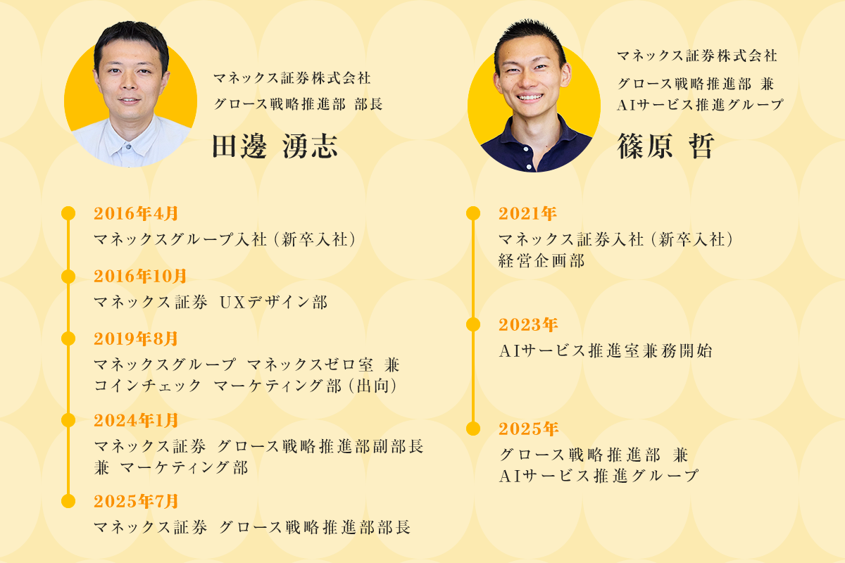 NTTドコモとの協業や、顧客ニーズに合わせたAIサービスの提供など、「一歩先の未来の金融」の実現と同時に、すべての人が自由に投資できる「投資の民主化」を着実に形にしています。こうした取り組みを支えているのが、柔軟な働き方と挑戦を後押しする企業カルチャーです。今回は、新規事業や社内変革の最前線で活躍する田邊さんと篠原さんに、それぞれの取り組みの裏側と、マネックス証券で働くリアルな姿についてお話を伺いました。